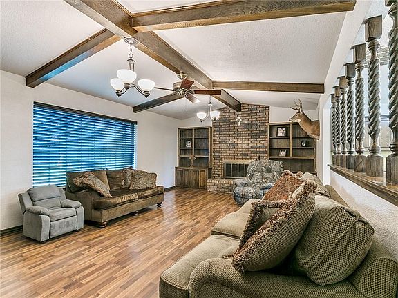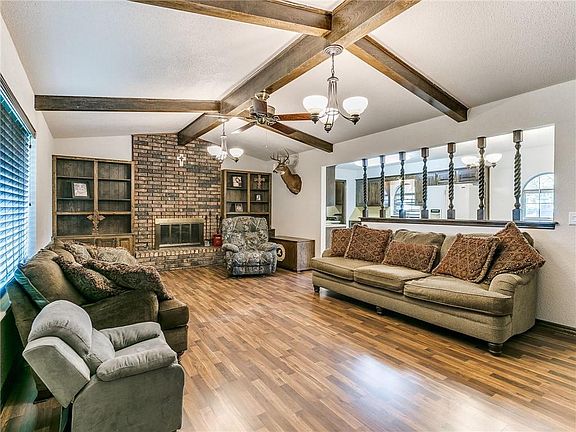 This home has it all! Country living right in town! The aerial view of the property shows the extensive fencing, large dog run, RV parking, storm shelter in backyard, & the beautiful courtyard that greets you as you walk towards the front door. Several things have been updated throughout the home including the Flooring, HVAC, Hot water tank, Well pump, & more! Call for the full list of upgrades! All 3 bedrooms feature new wood laminate flooring, fresh paint, 2in blinds, & double door closets. The home has an abundance of storage in the Kitchen, hallway, & bathrooms. The cozy living room features 2in blinds, ceiling fan, 2 built in bookcases, new laminate wood flooring, vaulted ceiling with wood beams, & a real wood burning fireplace! The backyard is your very own oasis with mature trees, a large covered patio to enjoy your morning coffee, & the property backs up to pasture land where you can enjoy seeing a few of the neighbors horses in the distance. This home won't last long!