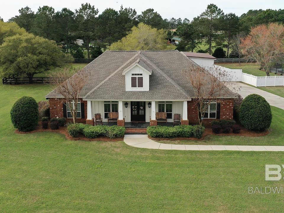 This custom Craftsman home sits on over an acre in the desirable estate lot community of Dominion Farms. This immaculate home offers heart pine floors, furniture quality cabinetry, and oversized 3 car garage (38' x 26'). The numerous upgrades include new roof (2021), new HVAC (2023), fresh paint, new ice maker, light fixtures, blinds, plumbing fixtures, and carpet in bedrooms. You will be welcomed by the covered front porch with copper gas lanterns and slate floors. The grand foyer invites you into a formal dining room with heavy crown molding and chair rail. A separate space across the hall is perfect for a formal living room, office, or even a 5th bedroom. The spacious living room with 12’ double trey ceilings, surround sound, and gas fireplace includes double French doors overlooking the expansive back yard. The kitchen is a chef's dream complete with GE Profile and Jenn Air appliances, 5 burner gas range, granite counters, convection oven, and large walk in pantry. A separate breakfast area overlooks the screened porch. The home has energy efficient windows, extra insulation in the attic, and an air filtration system. The primary suite on the main level includes 12’ tray ceilings, oversized walk-in closet connected to the laundry room, as well as en suite bathroom with travertine countertops and a jetted tub. The laundry room with utility sink has extra storage and beautiful travertine countertops. The additional bedrooms provide plenty of extra living space and walk in closets. Upstairs the 4th bedroom is a private suite with sink, cabinets, mini-frig and full bathroom. This exceptional home is just a short distance to the beautiful Weeks Bay Plantation property. Dominion Farms is Only 2 miles from Mary Ann Nelson boat launch, and a short distance to Pelican Point and Mullet Point. All information provided is deemed reliable but must be verified by the buyer.