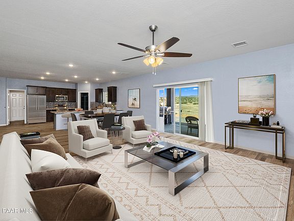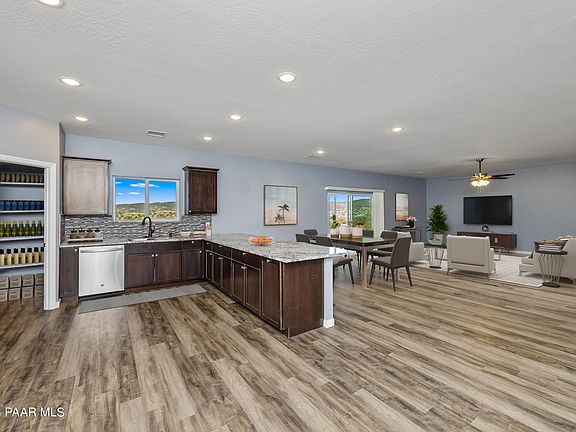 Excellent opportunity to own this ONE year old Ranch Style home on 1.52 Acres in the Dewey area with a 15 GPM Well & Easy Access to Prescott or Phoenix! This home features 2210 Square Feet with an OPEN/SPLIT Floor Plan having 4 Bedrooms, 2 Bathrooms, 3 Attached Car Garage. If an RV Garage/Workshop is On Your Wish List we can have a 40'x40' or 30'x40 Steel Building Constructed w/in 8 months of closing for an additional $130,000! GREAT ROOM Concept, Luxury Vinyl Wood Plank Flooring, 2 Tone Paint & Ceiling Fans. Kitchen is nicely appointed with Walnut Java Colored Shaker Cabinetry, GRANITE Countertops, Tile Back Splash, Stainless Steel Appliances (Fridge Included), Large Walk-In Pantry & Large Breakfast Bar in a Peninsula arrangement of the Lower Cabinetry.