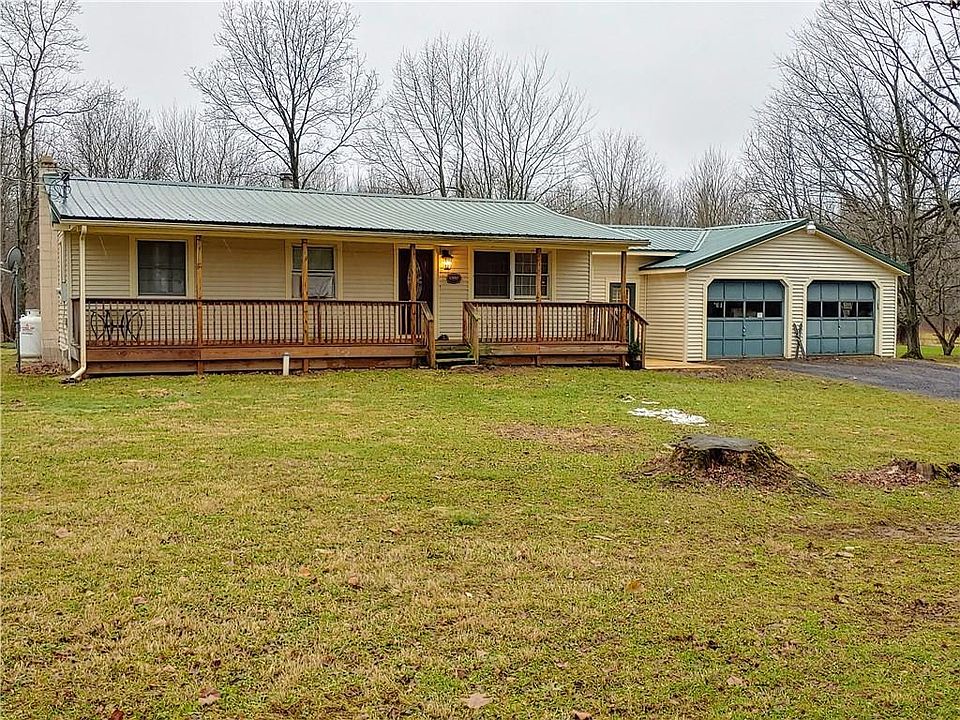 Cozy and charming, this 2 bedroom ranch is located in the perfect country setting with over 2 acres of peaceful land! Living room with attached dining allows for an open concept feel. Galley kitchen offers newer appliances with a stunning view of the back yard. Finished basement makes for a perfect family room, play room (or both) with room to spare. The Coal stove on main floor and a propane fireplace in the basement offers as additional heat sources for lower utility costs. Attached 2 car garage provides plenty of space with enough room for additional storage as well. French doors open to a large 2-tier deck off the rear of the house which allows you to sit back and enjoy the country atmosphere. Large list of improvements includes roof, siding and more. This gem won't last long!