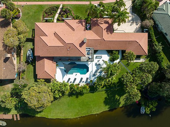 Rare opportunity to own this unique waterfront Estate on double lots! Situated on Lake Wellington, in the gated community, ''The Island.'' With 200 feet of water frontage and an elevated dock, this home is perfect for entertaining and enjoying the beautiful sunsets. The backyard features a tropical garden which is completely enclosed for privacy. This grand, 2-story home includes an elevator and has 7,030 sq. feet covered, and 4,871 sq. feet under air, which also has an independent apartment of 950 sq. feet with its own kitchen and bathroom. All windows have accordion shutters. The house previously was 6 bedrooms, until 2 of the upstairs bedrooms were converted into a suite with private balcony. Close to shopping, restaurants, equestrian facilities, and ''A'' rated schools
