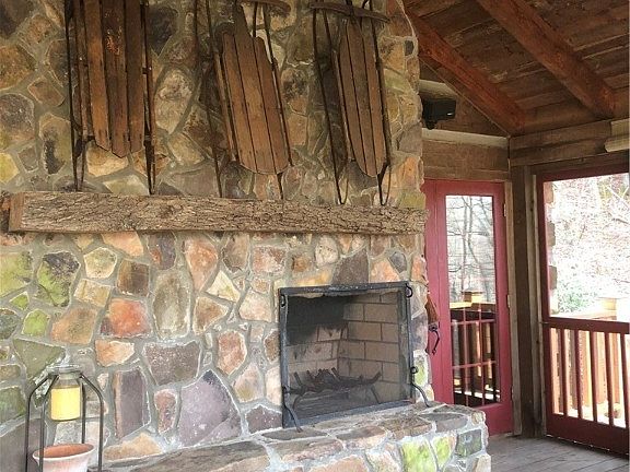 Discover the charm of true mountain craftsmanship in this exceptional lodge, built with massive hand-hewn Western cedar logs, antique heart pine floors, handmade doors, and custom woodwork throughout. The great room centers around a stunning stacked-stone fireplace and opens onto a spacious screened porch featuring its own stone hearth—perfect for year-round gatherings. A large deck extends beyond, offering serene views of the woods and the creek below.