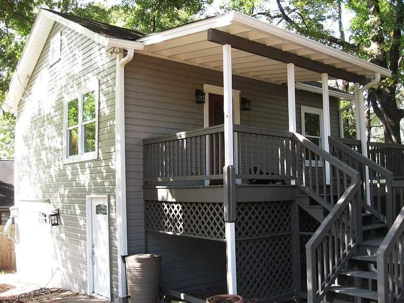 127 First Avenue. Unique 1920's carriage house overlooking a dedicated greenspace owned by City of Decatur. Cottage-feel features include heart pine floors, shiplap wall boards and pressed tin kitchen ceiling. Plumbing, electrical, roof and HVAC all updated with a complete 1999 renovation (a/c has since been replaced). Brand new windows and exterior paint. Downstairs is a one-car garage, laundry area and an unfinished storage area/workshop/studio that could easily be finished. Perfect for buyer who otherwise might consider a condo but wants private outdoor space and no HOA fees.
