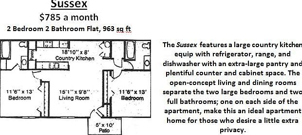 First month rent is free with a 12 month lease. We cover the cost of water, trash, and sewage so the only utility you would be responsible for would just be the electric (all appliances are electric). Available November 30. We currently have our Sussex apartment available for pre-lease. The Sussex features a large country kitchen equip with refrigerator, range, and dishwasher with an extra-large pantry and plentiful counter and cabinet space. The open-concept living and dining rooms separate the two large bedrooms and two full bathrooms; one on each side of the apartment, make this an ideal apartment home for those who desire a little extra privacy. Our apartments offer something to meet every need. Our one and two bedroom apartments are centrally located near shopping centers, close to Porter Memorial hospital, the post office, Interstate 94, Route 49, and the Indiana Toll Road to make your every day needs convenient. We are 10 minutes from 80/94 and the South Shore Line. Call or stop in today! We look forward to welcoming you home!