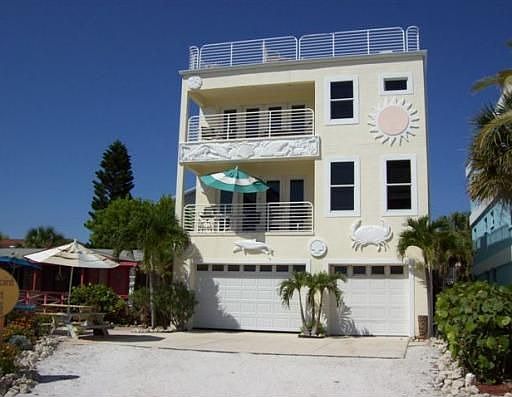Short sale. PRICED WELL BELOW RECENT SALES COMPS. Just 50 yards from the beach & 2 blocks to Siesta Village. This unique gulf front home has 2 units, a 3BR/3BA main home + 2BR/2BA in rear. Features unique Siesta architecture. Check out the fantastic panoramic views from the 1500 sq.ft. rooftop deck! Park up to 5 cars in the garage. Also features downstairs facilities & workshop/storage area. Interior main unit has crown molding & custom finishes with room for elevator shaft or extra staircase. This is the best deal for a newer gulf front property.