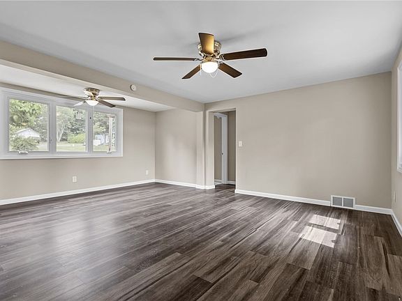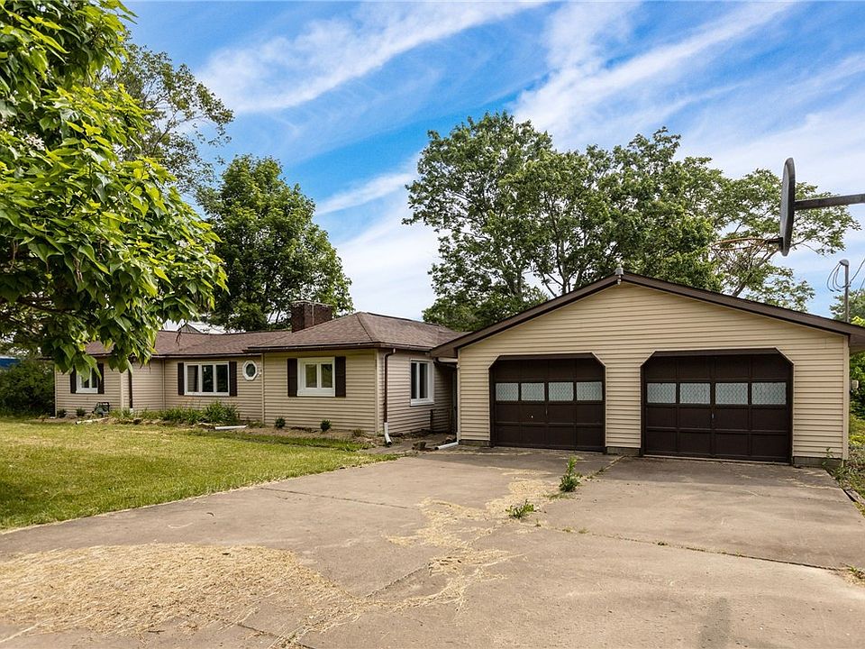 Peaceful country location but just 10 miles to Butler. This spacious ranch offers so much-NEW windows, NEW dine-in, beautifully equipped white kitchen with a plethora of cabinets and counter space, NEW full bath, NEW flooring and fresh paint throughout. Enjoy the lovely fireplace and hearth in the large living room with picture windows front and rear. Rest easy in any of three bedrooms all with large closets. The full bath is crisp, fresh and new. Step out, have coffee, and enjoy nature on the private rear patio. Sure to please the car buff-the oversized 2 car detached garage has plenty of room for a work area too. Covered breezeway between house and garage so groceries are a snap to unload. Large, level lot for pets and play.