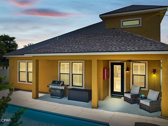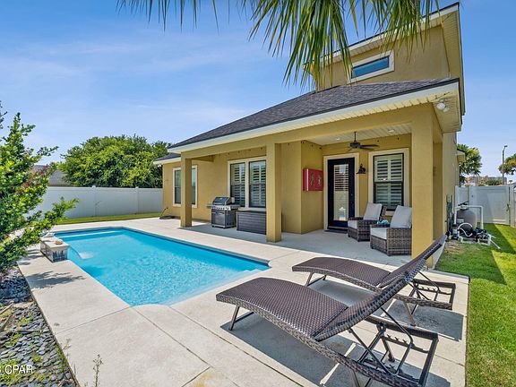 Rare opportunity to own a luxury, custom built home in Summer Breeze on Panama City Beach! Gorgeous Mediterranean style 3 BR, 2.5 BA home with INGROUND POOL, two car garage, and stunning finishes! This home is situated on a corner lot with immaculate landscaping. As you enter the custom, iron French doors, you will be greeted with tall ceilings, 6'' crown molding, hardwood flooring, and a formal dining room or media room. The floor plan is an open concept with a commercial grade kitchen overlooking the living room and breakfast nook. The kitchen features a gas range, built-in gas oven and microwave, granite counters, large island breakfast bar and all stainless appliances. Step out back into the oasis with an inground pool, covered lanai, & on-demand gas connection to grill! The first floor Master Bedroom is very spacious and overlooks the pool. The ensuite Master Bathroom has a deep soaking tub/shower, double vanities, large walk-in closet and separate toilet room. Upstairs you'll find a Flex Space for home office and two large bedrooms with shared hallway bathroom and extra storage closets. The home is on a corner lot 60'x100' with fenced yard and extra grass area by the pool. Hop in your golf cart and cruise down to the beach or go for a stroll down Front Beach Rd to Pier Park and enjoy the only Dog Beach in PCB for those with pups! This is a prime location to be close to the beach, shopping and airport! Don't miss your opportunity to own one of the most beautiful homes in Summer Breeze!