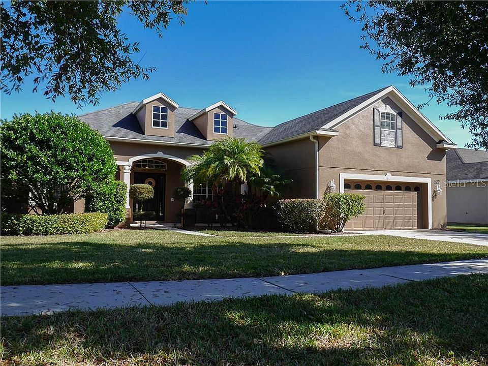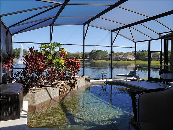 Welcome home! This executive, waterfront home is everything you need and more. The cozy front porch and dormers invite you into the grand, high ceilings and open spaces of your living and dining areas. The kitchen is well appointed with stainless appliances and plenty of counter space for baking our house parties. It also opens up to the great room and dinette making it feel very airy. The split floor plan design allows privacy to the master suite with two downstairs rooms and an office, along with a bonus room bedroom suite (which could be a second master) on the right side of the home, and a large master retreat which features dual closets, a jetted tub and walk in shower. The outdoor, dark, lagoon-bottomed, pool and covered lanai recreation area has magnificent views of the water and is ideal for relaxing or entertaining. If you like tech, you will love the Ring cameras at the doorbell and back porch, and the built in audio system. This private, tranquil, gated community also has a playground, basketball court and two swimming pools (one for toddlers) offering the amazing Florida lifestyle so many crave. This move in ready home won't last long - call to request a showing today. MAINTENANCE and UPDATES: Exterior painted 2019. New pool pump 2017.