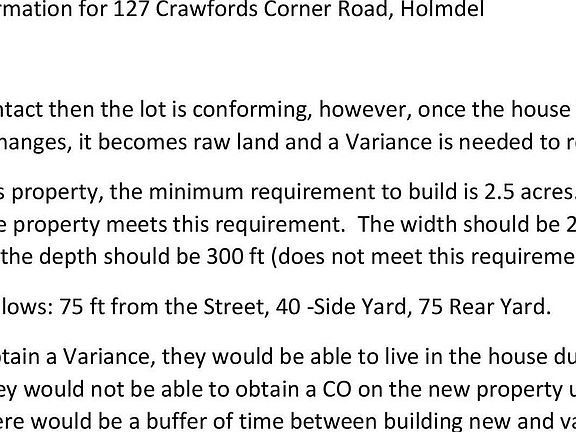 Spacious 5.48 acre property in one of New Jerseys most desirable and convenient areas. Easy commute via Parkway, train or ferry. Close to great shopping, restaurants and popular schools. Renovate the existing 3 BR home or build new. Creating your dream home will require a variance for frontage and depth, which the town views as possible. They also state that the quaint Colonial may be used while building; but must be removed before the new homes C/O is issued. Keep and renovate the steel barn at the corner of the property, and enjoy this beautiful setting with a bordering creek. The existing well is not operational, the Owners will provide a credit to connect to city water at the street. There is gas at Crawfords Corner Road, as well.