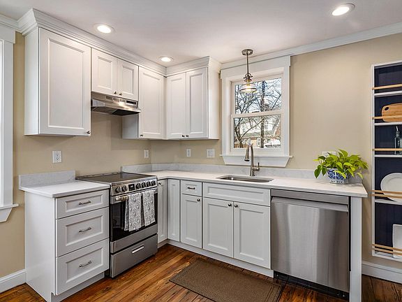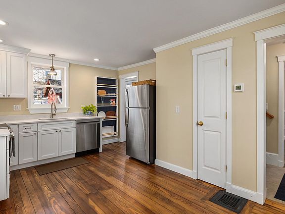 This charming Cottage at 127 Crescent Way is tucked away in one of Portsmouths' historic neighborhoods with lovely views of the Piscataqua River. In 1917 'Atlantic Heights' was built as a WW1 Shipbuilder's Community and is a village considered by experts the best example of its type built during that era. It is a vibrant neighborhood with Hislop Park down the street and a trail that leads down to closer views of the river. This home has been updated with a new kitchen with SS appliances and quartz countertop. Light and bright, it has been professionally painted in soft hues. Freshly refinished southern yellow pine floors add a warm glow to this serene retreat. The two bedrooms feature cathedral ceilings. Outside, there is a sweet garden with shed and speciman trees. Inside, Central Air, Renewal by Anderson insulated windows and standby generator.