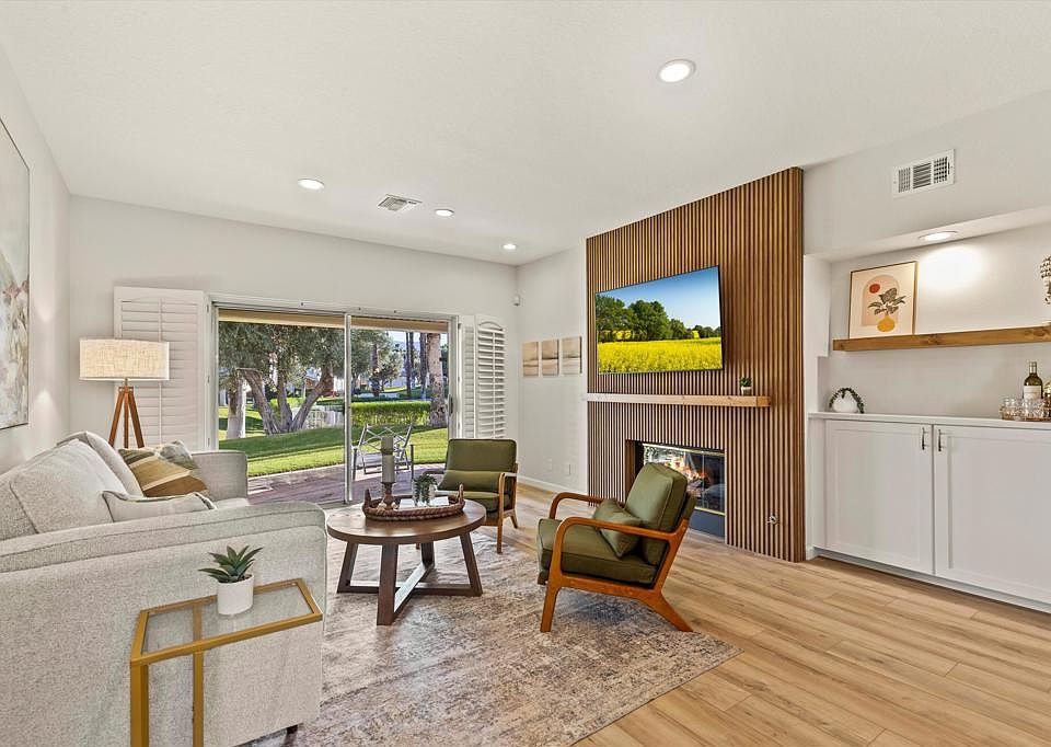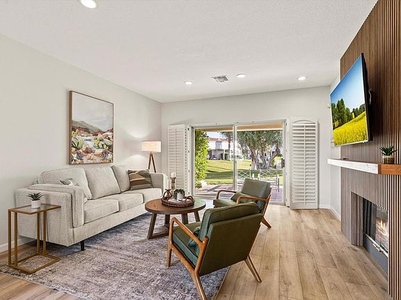 Discover Luxury Desert Living in this Stunning 2 bedroom, 2 bath condo masterfully renovated by DPS Capital Investments & Renovations. This Turnkey residence showcases sophisticated design elements typically reserved for luxury properties & features an open floor plan enhanced by elegant neutral tones. The gourmet kitchen boasts custom cabinetry, premium quartz countertops, high-end stainless-steel appliances, imported tile backsplashes, & a 54-bottle wine chiller. The inviting living room features custom built-ins, shutters, & a 65'' Smart TV. The primary bedroom has been transformed it to a spa-like retreat, complete w/a double vanity featuring integrated electrical outlets & heated illuminated mirrors, all accented by designer wallpaper. Recent upgrades include a new energy-efficient HVAC system, water heater, in-unit washer & dryer, & garage refrigerator. This meticulously furnished property is offered completely turnkey, allowing you to begin enjoying your desert lifestyle immediately!Located withing the prestigious Desert Falls CC, residents enjoy access to world-class golf, Tennis & pickleball facilities, along w/ a state-of-the-art Fitness Center. The HOA includes 24 hr. Security, all pools & spas, Fitness Ctr, Tennis & pickleball, maintenance, Cable TV, Wi-Fi, exterior insurance. Prime Palm Desert location places you 10 minutes from El Paseo premier shopping, the Finestrestaurants, galleries-Essential services moments away, & Palm Springs International A/P! ACCEPTING BACK UP OFFERS!