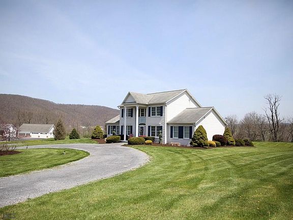 This impressive colonial home has so much to offer!! Two-story foyer with cer. tile floors; open concept kitchen (granite counters), living room and dining area; formal dining room with pocket doors; den with oak floors and built-in bookshelves; first level master suite w/ bath and walk-in closet; main level laundry; and a half bath. Second level offers four bedrooms and two full baths. Well finished basement with rec room, wet bar (granite counters) & gas fireplace; family room with a multitude of built-in shelves; and a full ceramic tiled bath complete with a whirlpool tub. Great setting with large 2.155 acre lot and less than two miles to downtown Bedford. Heat pump with CA and propane back-up, central vac and two-car integral garage. Dumb waiter from garage to main level!