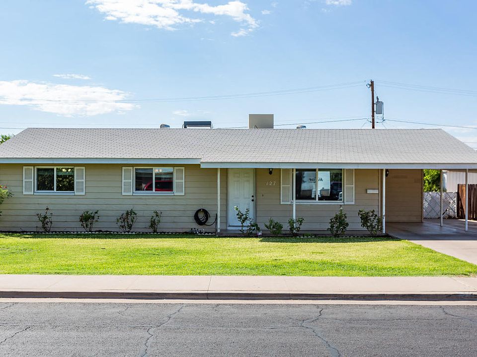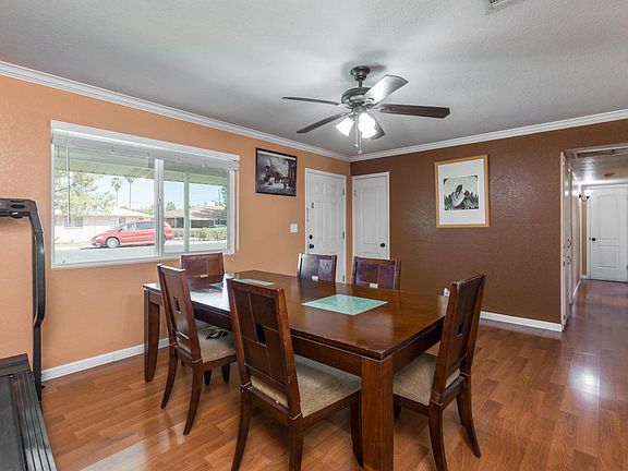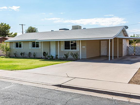 This 3 bedroom, 2 bath home sits on a large lot in an established community with no HOA & offers separate living and family rooms in 1288 SqFt. The kitchen features 36'' maple cabinetry, granite countertops, black/stainless appliances & breakfast bar for casual dining. The family room is wired for surround sound and french doors lead out to the covered patio and large backyard with grass, desert landscaping, fruit trees & storage shed. The master bedroom has a private bath. Other features include newer A/C & windows (2017), tile & laminate flooring throughout (no carpet), crown molding & 2 car carport with extended driveway. Convenient access to the 101, 202 and 60. See today!