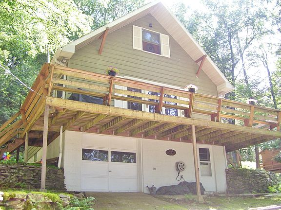 Millbrook Community at Lake Wallenpaupack! Chalet style property features 4 bedrooms and 1 1/2 baths. The main level offers an open concept floor plan with a living room with a wood burning stove, dining area and kitchen, 2 bedrooms, full bath and an amazing deck for relaxing and entertaining after a day on the lake. The second level features 2 bedrooms and a half bath perfect for overnight guests. The lower level has a mud room, laundry area, workshop and a 1 car garage. Plenty of parking included for boat storage, family and friends. The Millbrook Community offers a park like setting on Lake Wallenpaupack for swimming, picnics and enjoying amazing views of the lake. A boat slip is available through the association. Maintenance free exterior and move in ready!