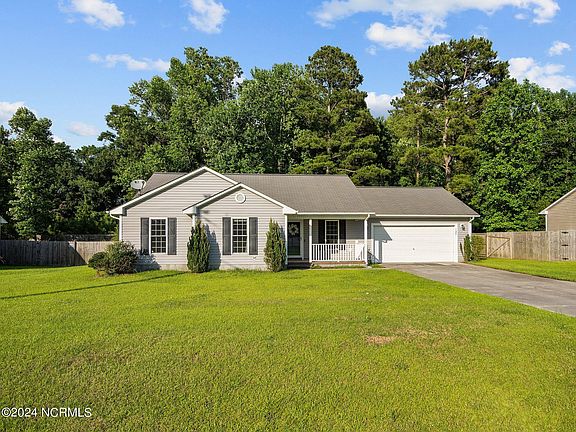 Welcome Home to 127 Laredo Drive! This adorable 3-bedroom, 2-bathroom home is nestled in the desirable neighborhood of Rockford Forest which is conveniently located near New River Air Station, Camp Lejeune, and Stone Bay. Step inside to discover laminate flooring throughout, providing a clean and modern look that's both stylish and easy to maintain—no carpet anywhere in the house! The spacious living room features a pretty stone-covered fireplace, creating a warm and inviting focal point for family gatherings and cozy evenings. The kitchen boasts a beautiful backsplash and ample cabinet space. Situated on a large .92-acre lot, this home offers endless possibilities for outdoor activities, gardening, and relaxation. The newly redone back deck is perfect for barbecues or simply enjoying the serene surroundings with a morning coffee or evening drink. Don't miss the opportunity to make this charming home your own. Schedule a showing today to see all this home has to offer!