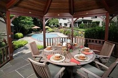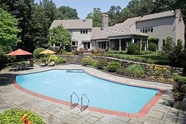 Elegant cape nestled in private neighborhood of 7 homes offers " Luxury inside while never letting you forget nature's beauty outside" (South Shore News). Lots of glass,open spaces, vaulted ceilings, exposed beams, wet bar, floor to ceiling stone frplc, granite kitchen with frplc, French doors to tiered patios w surround sound, free form heated pool (renovated 2012), cabana & entertainment sized gazebo. Finished walk-out bsmt with separate entrance offers options for au pair or in-law.