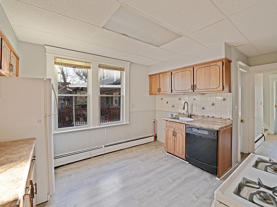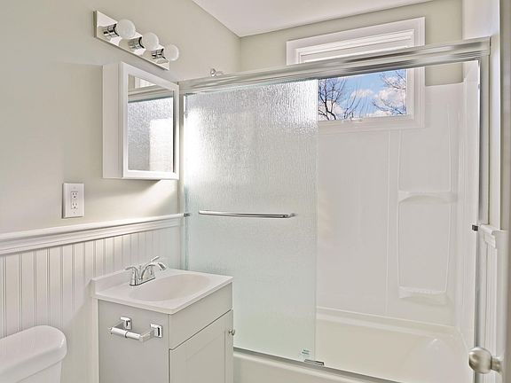 Come view this 4 bedroom 1.5 bath in Waterbury! The kitchen has wood styled cabinetry and white stove and refrigerator. Three bedrooms on second floor and one bedroom in basement. Walk-out basement. Fully remodeled full bathroom on second floor. The bathroom has a new tub has sliding glass doors with silver pull. Modern gray vanity with silver faucet and square mirror above. Beautiful, deck off the kitchen overlooking the backyard. Large, fenced in backyard! Just a 4 minute drive to Waterbury's Hamilton Park!
