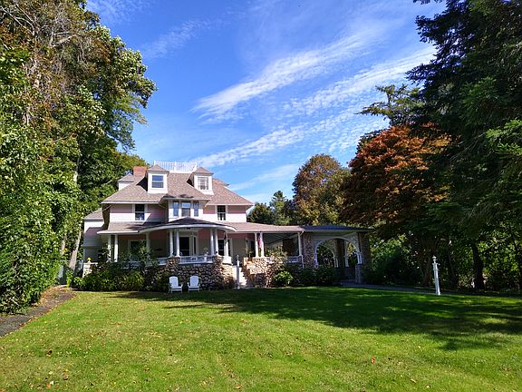Handcrafted stonework and woodwork are featured throughout this lovingly restored village home in Cape Cod's oldest town centre. Grecian pillars and an ornate staircase sit at the heart of this gracious Victorian home. Fireplaced living and dining rooms, hot rock sauna and many upgrades and improvements. Magnificent beaches minutes away. History of 127 Main Street "Overlook House" in Sandwich Village has been a showplace Victorian Queen Anne home since it was built in 1880 by English glassmaker Edward J. Swann. Successive owners were, Henry Francis Spurr, who like Swann, worked with the Boston and Sandwich Glass Factory, and Henry Alden Belcher, a Boston department store owner. The main rooms retain their authentic refined classic art craftsmanship. Stonework by Frederic Olmstead edges the home's spindle work-trimmed porte-cochere, a column-lined mahogany veranda and an elliptical porch. A copper garden muse doorknocker enlivens the paneled front door, which is flanked by glass sidelights. The living room has Corinthian fluted columns and pilasters, 14-inch-wide cornices with four molding styles, acanthus leaf modillions, a wall fresco and a quarter sawn oak floor. The living room’s fireplace, with floral tile trim and a cast iron fire back with gridded fleur-de-lis detail, is flanked on each side by an inglenook and cream paneled walls. From the foyer, French doors with bubble-glass doorknobs open to a sitting room with yellow ocher plaster walls, quarter sawn oak wainscoting and a Greek key cornice molding. Paneled pocket doors of solid oak lead to a bay-windowed dining room, with a fire placed dining room of buff flint brick and a mahogany Victorian overmantel. The elegant main staircase has rope, spiral and corkscrew balusters, and carved wood acanthus leaves trim the stringers. The second floor has a wide hall with oak parquet flooring leading to a solarium, an office, an exercise room (both of which could be bedrooms) a large master suite with walk-in closet, second sink area and tub. A private, large second master suite with French doors, walk-in closet, double-vanity, walk-in tiled shower and tranquil cedar sauna top off this gem. Large closets are plentiful and high ceilings throughout enhance this gorgeous home. A large sun-lit room with closet and bathroom is located on the first floor at the rear of the home and currently has a separate entrance making this space a perfect in-law suite or rental opportunity. The third floor rooms can be accessed from the main staircase as well as by a private-entranced, rear staircase. High ceilings throughout and the third floor widow’s walk glorify this home’s history.