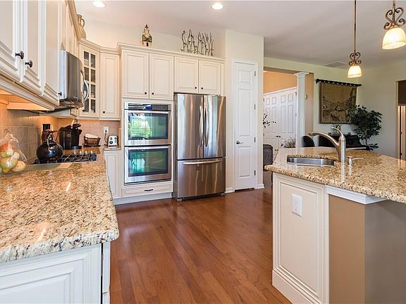 Move in & unpack in this pristine Prestwick on a premium oversized lot! Stucco exterior, prof landscaping & custom walkway greet you. The entry has gleaming HW floors, decorative molding & a double entry closet. The LR/Den/Study has French Doors. DR w/ tray ceiling & decorative molding. Fantastic upgraded off-white kitchen w/ SS appliances, double oven, lites under the cabinets, LOW granite countertops & HW floors. Sliders lead to your private patio w/ overhang, surrounded by lush landscaping & an oversized area w/ plenty of privacy! The Master Bedroom has a tray ceiling with ceiling fan, a walk-in closet & double doors to the luxury bath w/ upgraded tile, vanity, double sinks, tub & shower. There's a guest bedroom located right next to the full guest bath. A laundry room w/ washer/dryer, garage w/ painted floor & cabinets. This home is in mint condition & ready for you! Expanded Garage - Premium Lot - Security System. COME...JOIN THE PARTY TODAY!