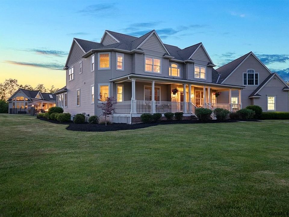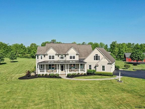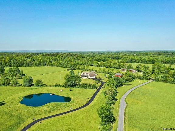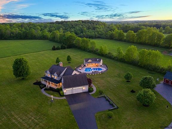 Stunning custom estate in a magnificent setting on 26+ acres of manicured meadows. Flowing open floor plan with an abundance of glass brings the beautiful outside views in. Numerous upgrades with top quality construction (list in MLS Docs). Conveniently located close to Saratoga Springs and the Capital District. First flr master suite adjoins a delightful bright sunroom with views of the pool complex. Loft on 2nd flr overlooking the foyer and great room. Plenty of acres for horses or space to enjoy the country setting. As you approach the house a pond with a fountain greets you 1/2 way there. Currently owner has partial Agricultural tax exemption-neighbor hays some fields. 4 bay barn style garage is large space for storage not far from main house. This lot can be subdivided to 2 more lots!