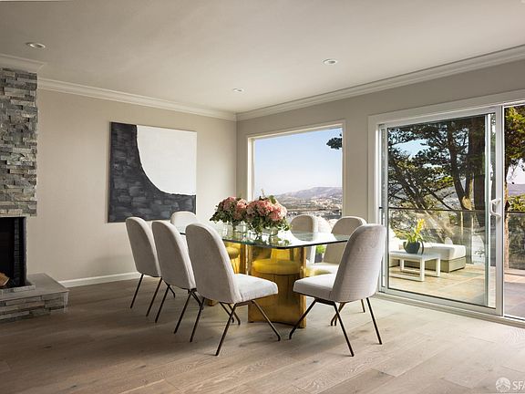 Located on a quiet block in Miraloma Park, 127 Molimo combines mid-century design with modern updates, family-friendly layout, and sweeping southern outlooks. The main level is bright and airy, oriented to the south with an open living, dining area and a well appointed kitchen with eat-at island, stainless appliances, skylight, and pot filler over the stove. Floor to ceiling windows open directly to a walk-out terrace perfect for entertaining or quiet mornings with views to the South and to The Bay. Two generous bedrooms with a Jack-and-Jill bath complete this level. The entry level is devoted to an oversized primary suite, with its own gas fireplace, a comfortable sitting area, an updated bath with contemporary finishes, and a custom walk-in closet, and nearby laundry room. Downstairs, a flexible bonus level serves as an ideal playroom, media space, or guest bedroom and opens to a grassy, fenced backyard. A few blocks away from Miraloma Elementary and moments from Mount Davidson's scenic trails, Glen Canyon Park, Mollie Stone's/Tower Market, and the shops along Portola Drive, this fully renovated residence offers a quiet neighborhood setting with quick access to daily essentials. A rare opportunity to enjoy design, functionality, and city outlooks in this desirable enclave.