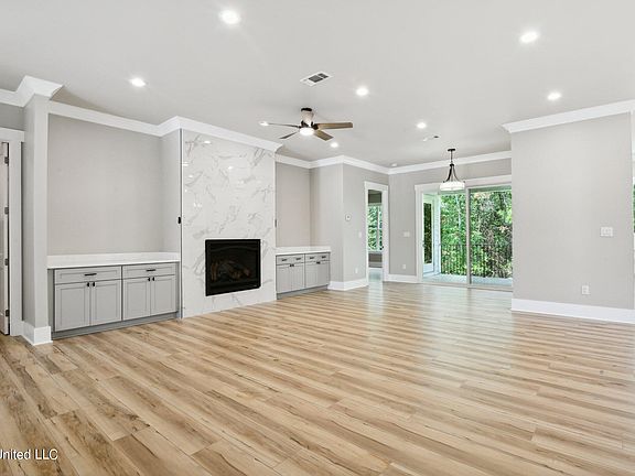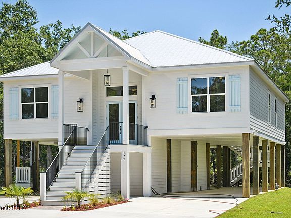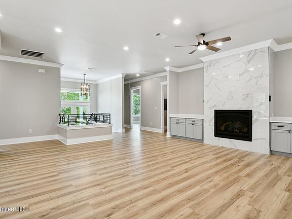 This newly constructed home is ready for its new owner. The half acre lot offers a quiet, oak tree shadowed location on a cul-de-sac location that can not be beat! Close to the Bay and Dunbar Pier; Hot Casino action and Championship Golf designed by Arnold Palmer at Hollywood; and the art, shopping and entertainment. This location offers a quiet and private feel that's all a golf cart ride away from Old Town Bay. St. Louis. Downstairs is 2300 sq. ft. of covered space - with heights to accommodate events plus parking for cars, trucks, boats and a class B or C motorhome. The dramatic entryway at a mid level foyer offers an impressive view into the living area where you'll find ten foot ceilings, solid wood 8 foot doors, a massive great room with an automatic and remote controlled, top of the line gas fireplace. The kitchen is beautiful with a large center island perfect for entertaining and cooking, custom cabinetry and high end, Bosch stainless steel appliances. The dining area has an impressive bar with beverage center and large glass doors and balcony overlooking a peaceful woods area. All the bedrooms include their own bathroom and custom closets while the primary having a large soaking tub, a wonderful shower with multi jet functions and a dual vanity with frameless and anti fog mirrors. and the dramatic ceiling offers an impressive suite you'll enjoy retiring to. The house also features a safe room offering privacy, security and storm protection with all high impact resistant windows. In addition, there is a large ground level rear entry foyer that can be used for additional entertainment and/ or recreation year round with zoned ac/hear. Seller would consider lease purchase. Note: Floor plan in pics do not indicate closets, please see pictures and the 3D immersive tour.