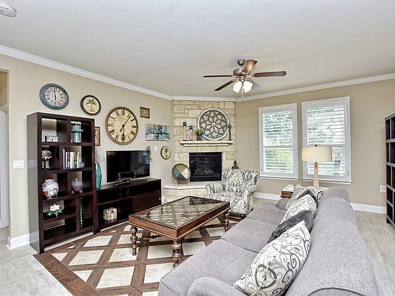 Stone Hill Neighborhood. Copper Ridge floorplan. I have a confession to make, I really love this two bedroom, two bath with flex room home. There are hard tile floors throughout this open floorplan. Secondary bedroom has carpet. The stylish front door leads to an open foyer. Kitchen has abundant cabinetry, granite countertops and stainless-steel appliances. Cozy up to the stone fireplace in the living area. Notice the custom tile floor in the living area. Primary bedroom is bright with natural lighting. Primary bath has dual sinks, walk-in shower with bench seat and a huge walk-in closet. Split floor plan, flex room could be an office or craft room. Central vacuum. Shutters throughout. Full gutters. Irrigation system. Exterior is stone and brick. Delight in the lovely outdoor living space and beautiful Hill Country views while grilling or sitting by the outdoor fireplace. A great place to enjoy your favorite beverage after a hike, round of golf, workout or a pickle ball win. Curious what makes Sun City a great place to live, call for an appointment and I will show you all the amenities.