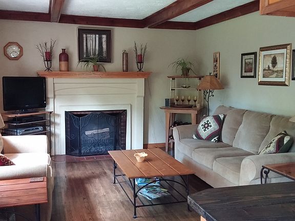 Beautiful home nestled in the tree tops. Built as a "carriage house" & servant's quarters, this unique home offers flexibility! Enter the front door into the "wine" room/family room, with steps leading to upstairs. There's also a beautiful tile bath w/walk-in shower & a three season room that's easily converted to year round space. Also a small kitchenette for summer entertaining outside. Upstairs you feel like you're in a nest, with tree tops all around you.Great living room & kitchen combo with dining area. Appliances included. Original French doors to small porch & steps to yard. Must see!