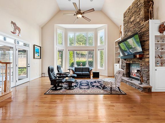 Charming farm on 5.4 acres in Landrum's Gowen's Fort gated community. The main level primary suite features a gas fireplace, dual vanities, jacuzzi tub walk in tile shower, double closets and triple doors leading to a screen lanai -- a serene year-round retreat. Upstairs included two en-suite bedrooms, a dedicated flex/office space and a finished room above the garage --ideal for guests, multi-gen living, remote work, or recreation. An open concept kitchen and living room anchors the home, where smart-enabled appliances deliver real-time alerts directly to the 75" TV. Soaring ceilings and a stunning double sided stone fireplace elevate both the living room and the adjacent dining space. Built-in surround sound throughout the home enriches the atmosphere for entertainment and relaxation. The 4-stall barn includes hay storage, fenced pastures, and a fully independent efficiency apartment with kitchen, full bath, and a private stone patio and fireplace --suitable for guests, caretakers, or income potential. This property offers the perfect set up for up to 4 horses, with direct access to community trails. This home and neighborhood is well-suited for non-equestrians as well. 22 miles to TIEC and 34 miles to GSP