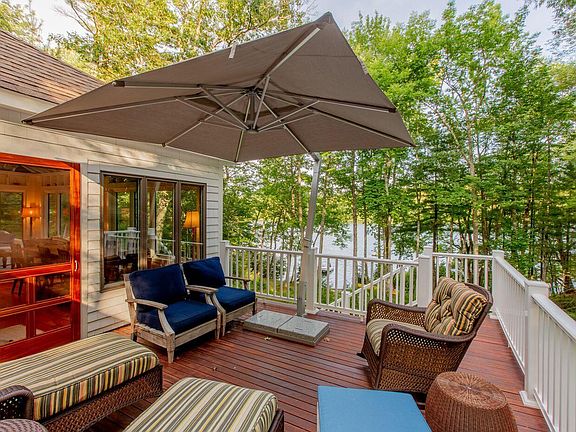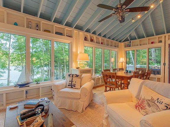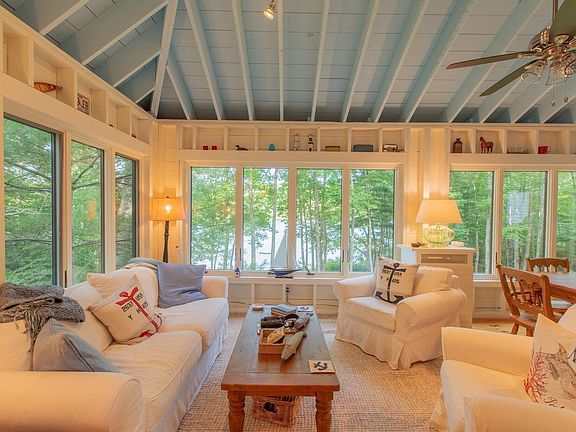 In a premium location on coveted Hobbs Pond, this idyllic waterfront property offers 1.84± acres and excellent broad views of the pond. The five-bedroom residence is a charming cottage in very good condition with comfortable living spaces, appealing character, and thoughtful updates. It features an open great room with a cathedral-style ceiling, wood-paneled walls, and exposed wood beams. A year-round sunporch has plenty of windows offering wonderful views of the pond and there are two well-integrated decks. The landscape has been professionally maintained with areas of lawn, established perennial gardens, rock walls and a walking path that leads to additional land for outdoor recreation. The property includes a cozy, versatile bunkhouse, a practical shed/garage, and 303± feet of frontage on the pond with a dock, float and a pebble beach area.