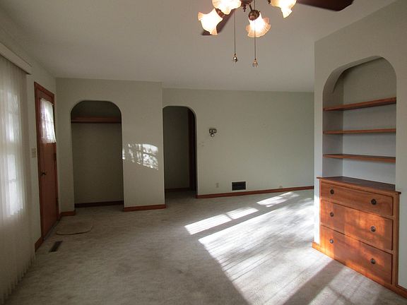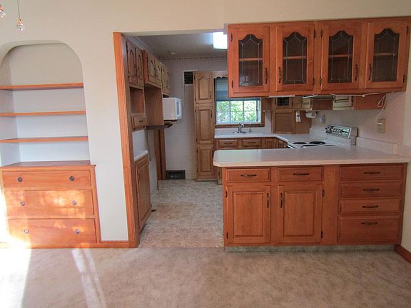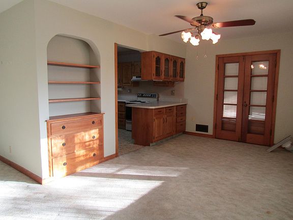 Charming home on the edge of town! This home welcomes you with a spacious L-shaped living room and dining room. The living room has a patio door leading to the back deck. Enjoy grilling or sitting on your back deck watching the wildlife! Dining room has a built-in hutch, opens to the kitchen and has French doors leading into the 3-season porch, a great place for morning coffee or to relax and read a book! The kitchen features ample attractive and updated oak cabinets. Stove and microwave are included. There are two bedrooms on the main floor with both having hardwood floors, and a full bath. The basement is ready for you to finish as you wish! Washer, dryer and second oven are included. There are plenty of storage cabinets. Basement door opens into the two car attached garage. Home is being sold "AS IS". Cash or pre-approved conventional financing.