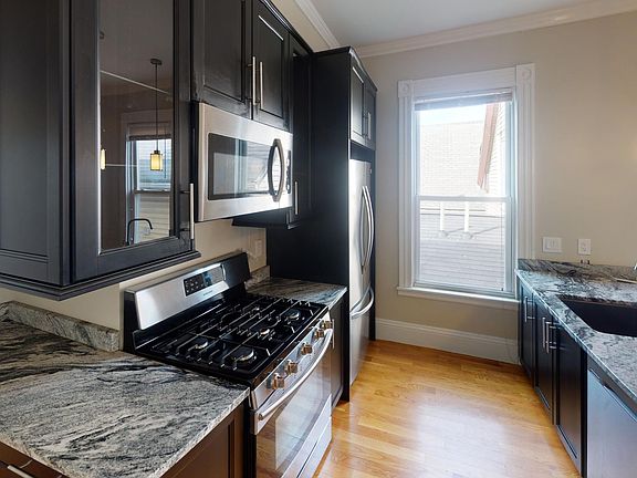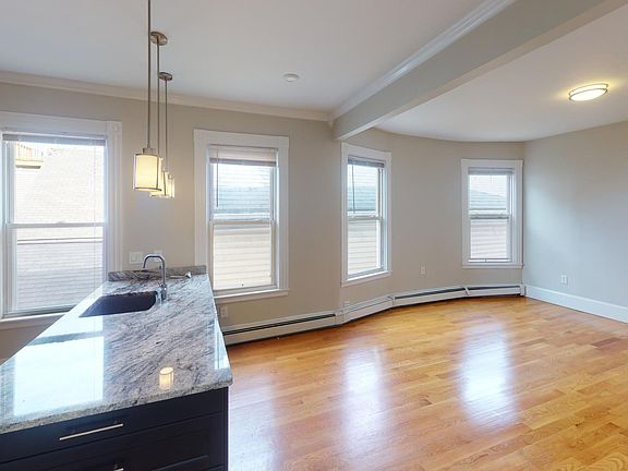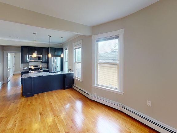 First floor and finished basement in spacious triple decker. Brand new renovation with high end details. Kitchen with granite counters, dishwasher, disposal and microwave. On first floor, 4 bedrooms, one bath in a very efficient layout with lots of closet space. Two spacious finished rooms and another full bath in basement. Private laundry. Replacement windows. High ceilings. Wood floors. Deck overlooking pretty yard. no fee, one year