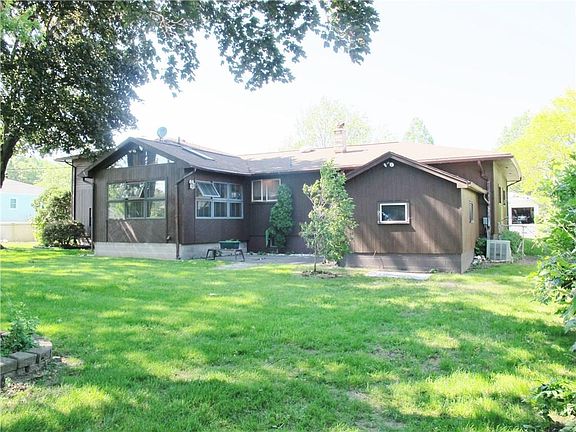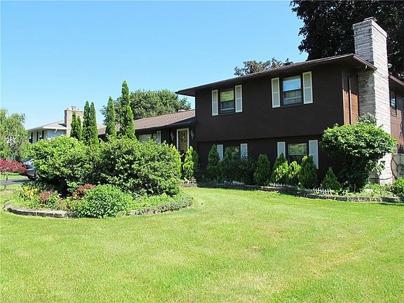 Sprawling split in WEST IRONDEQUOIT SCHOOL DISTRICT. Lovingly lived in home offers three nice sized bedrooms in top floor & a forth on the first floor. All bedrooms have access to FULL bathroom on the same floor. Home also has HUGE kitchen so everything is truly possible here. FOUR separate living/entertainment area inside the home. BEAUTIFUL FOUR SEASON room (w/heat) w/tranquil view of the whole park like back yard from the three walls of windows 7 skylights. Upstairs living room along w/a family room downstairs w/wood burning fireplace. The partially finished basement includes a bar w/plenty of room to entertain. This place is a rare find & has been lovingly maintained over the past 11 years. Enjoy the fully fenced & treed backyard from your patio or tinker away in your heated garage