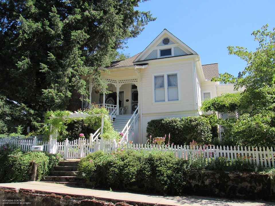 Live in Victorian elegance! This homes beauty starts at the curb. The updated kitchen features high end appliances, cherry cabinets and quartz counter tops. The master bath has an amazing stain glass window and a marble slab in the shower. The home has white oak flooring throughout and a mantle in the living room that's from South Carolina. Enjoy a glass of lemonade while sitting out on the covered front and side porch. Don't miss the door in the floor of the laundry room. It leads to a wine cellar. Under the house has tons of storage. Home has off street parking and a 1 car garage. The 3rd bedroom is being used as an office. Home is in walking distance to shops and restaurants in down town Grass Valley