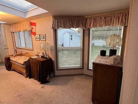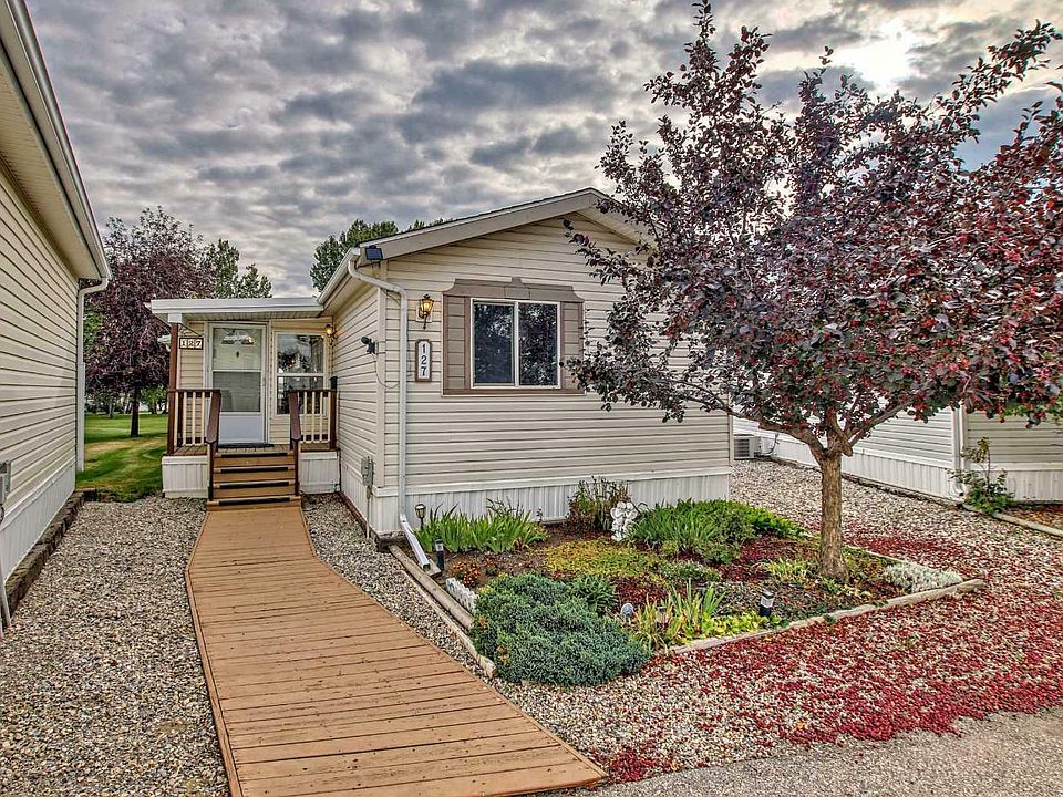 Welcome to 127 Ranchwood Lane, a beautiful air conditioned 3 bedroom 2 bathroom home. As you enter at front of house you are greeted by a large entrance area with double coat closet, a spacious bedroom, laundry room and 4 piece bathroom. The kitchen, dining area and big bright living room are all open to each other creating a nice flow for entertaining and ease of access. The kitchen has extra counters and cupboards with pull outs allowing for plenty of food and small appliance storage space. The dining area off kitchen has a table for 6 and hutch which easily fits the space. Two high top chairs can also be used at the island for a breakfast bar. The living room will fit all your large furniture and is filled with natural light from the wall of windows looking out to the deck. Down the hall tucked away is another bedroom and the primary bedroom which accommodates king sized furniture and has a walk in closet and 4 piece ensuite. The addition extends the entire length of the home and starts at the front entrance with an enclosed 190 ft2 3 season sunroom that has two huge skylights, electricity and lights. A wonderful place to spend the cool evenings. The deck continues with an open garden and seating area in the middle and the covered portion at the back has pull down blinds to block the weather when required. You can enjoy being outside no matter what the weather with these three options! There are three exit doors from the home all on to porches. The home is roughed in for vacuflow, has central air conditioning, has pullouts in the kitchen and a piped in salt free water softening system. The workshop/storage at the back of the property has power and lights and is a great spot to tinker with small repairs and store garden and household items. Pad rent Includes lawn maintenance and snow removal. There is an Estates community center where a large variety of events and entertainment take place. RV Parking is also available at an additional cost.