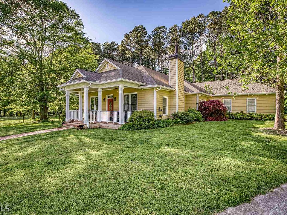 Stunning 17+ acre equestrian property with a spring fed pond, a 40x140 barn with apartment plus 6 additional outbuildings, 68x200 lighted arena, plus 5 main pastures with separate gates and also in the woods behind the house is a 6th gated fenced pasture. Ten 12x12 stalls and a 12x24 stall in the main barn plus a private 15x15 foaling stall with adjoining paddock. Large tack room with 2 grooming bays and a wash bay with H/C water. Outbuildings include 16x44 workshop, 16x48 farrier shed, 16x44 trailer/RV shed, 30x51 3 bay shed with foaling stall, 12x40 implement shed, 14x36 manure shed with dump ramp, and run-in shed. Private entrances for the horse farm and residence. Move-in ready ranch style home with rocking chair front porch. Large family room with built-in bookcases and a marble fireplace. Beautiful eat-in kitchen features stainless steel appliances, granite counter tops, tiled backsplash, and large island. Owner's suite has transom windows and doors to the patio, double vanities, jetted tub, and separate shower. Large mud/laundry room with plenty of cabinets and a wash sink! Two secondary bedrooms and a full bath. Pastoral views surround this home and just 18 miles to Georgia International Horse Park.