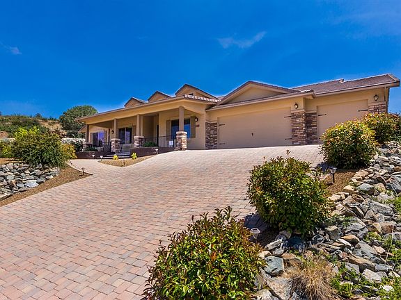 Quality single level home with 3 car garage in private location just minutes to downtown Prescott. One of the lowest priced homes in this upscale subdivision. Home features views north of Mingus Mountains, open floor plan, deluxe eat-in-kitchen with stainless appliances, granite counter-tops, custom alder cabinetry, formal dining area, stone fireplace & spacious master-suite with his & her closets. Front and rear yard has extensive landscaping and rock work with drip systems. Private covered deck in back. Paver driveway, concrete tile roof, custom stone work around home. Owners use front covered porch to relax and enjoy the views!