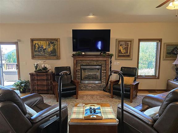 Discover quality and elegance in every detail of this impeccable open concept home. With five spacious bedrooms, this residence boasts a seamless blend of comfort and luxury. Inside, you ll find tile and wood floors throughout, solid surface counters, rustic alder cabinets, and stainless steel appliances in the kitchen. The living room features a gas fireplace and vaulted ceilings, creating a warm and inviting atmosphere. The finished basement, with above-ground egress windows, provides natural light and a sunny ambiance, along with ample storage space. Outside, enjoy a large composite deck perfect for outdoor entertaining and a beautifully designed patio with a pergola, surrounded by lush landscaping. The spacious 3-car garage with tall ceilings adds convenience and functionality. The ideal floor plan allows for main floor living, with the added bonus of a finished basement. Experience the best of Wyoming views from your deck or patio, perfect for relaxing or entertaining. This home is a perfect blend of indoor comfort and outdoor enjoyment. Don't miss the opportunity to make it yours!