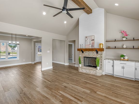 Stunning new construction in Pin Oak Landing. Use a preferred lender for FHA & VA interest rates currently at 5.25%; Conventional at just 5.875%! Don't miss out on this amazing 4 bed, 2.5 bath home with 2196 sq ft. Open floor plan with gorgeous, wood grain ceramic tile throughout living, dining, & kitchen areas. Gorgeous kitchen that is open to the living room featuring granite countertops, stainless steel oven & separate gas range, dishwasher, built-in microwave, breathtaking backsplash, focal point vent hood, & great size kitchen island adding for additional storage & bar seating. Separate dining area with custom lighting that allows for larger gatherings or could double as an office or game area. Living room has a brick fireplace with gas starter and built-in cabinetry with floating shelves. Remote master suite with tray inset. Great size master bath with custom cabinetry featuring his & her sinks, granite countertops, garden tub, & separate shower with custom tilework from floor to ceiling including around bathtub. Great size walk-in closet as well. All guest bedrooms are a very good size with carpet, & ample closet space. Great size utility room that is just off the garage entry hallway which also features a mud bench for all of your daily items to be store. Great size backyard with covered patio. Hurry today to snag up this beauty that is ready for its first owner. Come enjoy the remote privacy and quiet living that is Pin Oak Landing. Must see!