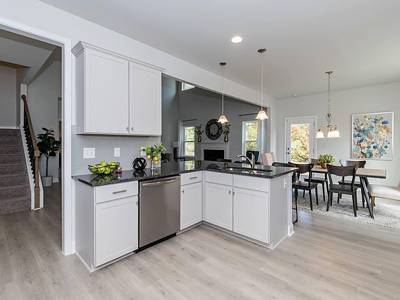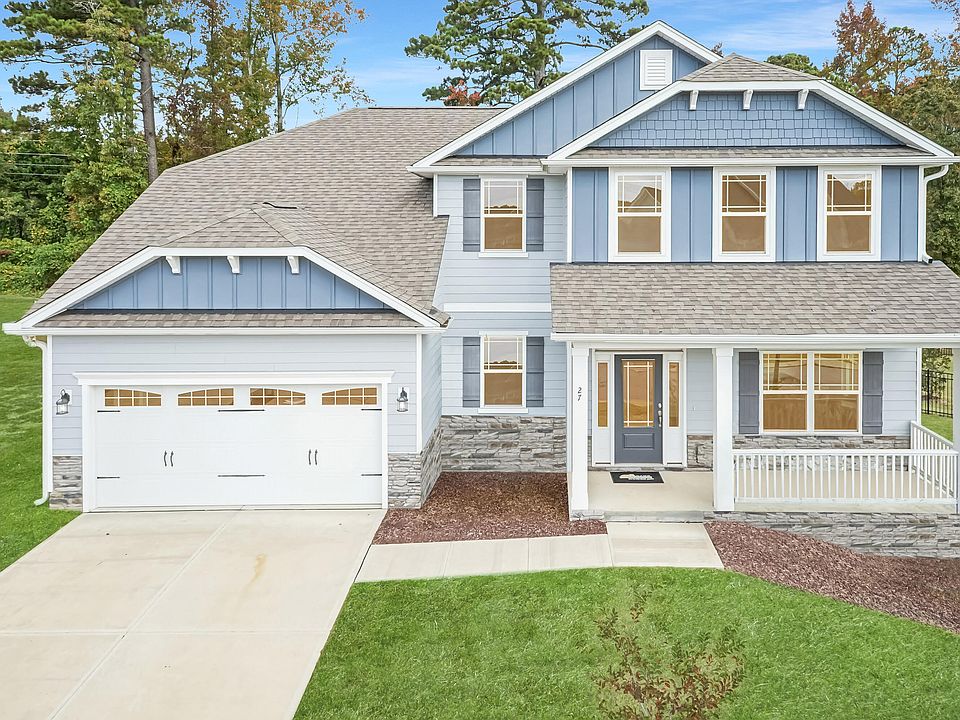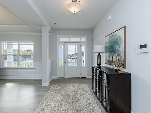 Pictures are representative and may not be of the actual home. This beautiful 2-story home offers both luxury and comfort, nestled against a backdrop of trees. Enter through the covered porch into an inviting foyer that leads to a spacious family room with a cozy fireplace and 20-foot ceilings. The elegant dining room features a tray ceiling, crown molding, and wainscoting. The gourmet kitchen includes a large island, granite countertops, ceramic backsplash, and stainless steel appliances. Upgraded laminate flooring spans the main living areas, complemented by 9-foot smooth ceilings and ceiling fans. The primary bedroom boasts a tray ceiling, crown molding, and an en-suite bath with a ceramic tile walk-in shower, double vanity, garden tub, and a walk-in closet. Additional features on the main level include a laundry room, walk-in pantry, half bath, and patio.