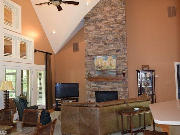 One level, ranch style home with stone and wood finish. Two-car garage equipped for storage. Located at the end of a quiet cul-de-sac overlooking the 10th fairway. Great room with vaulted and angled ceiling, stacked stone fireplace. Kitchen open to Great room and Dining area. Master Bedroom with En-Suite Bath - granite countertops, walk-in shower, storage. Low maintenance natural landscaping.