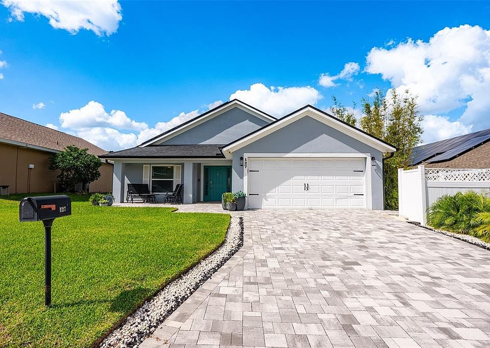 Seller may consider buyer concessions if made in an offer ~ Welcome to Davenport’s Florida Pines community and this updated 4-bedroom, 3-full bath POOL HOME with an OWNED WHOLE HOME SOLAR SYSTEM (w/ battery backup!) to keep energy costs low, a NEW ROOF (2022), NEW TRIPLE PANED HURRICANE IMPACT WINDOWS (2022), NEW A/C (2021), and a NEW 40 GALLON ELECTRIC WATER HEATER (2021)! Whether you live here full time, use it as a home away from home or SHORT TERM RENTAL investment this beautiful home delivers a light and bright OPEN CONCEPT floor plan with WOOD LOOK PORCELAIN TILE FLOORS THROUGHOUT, a bright and cheerful kitchen complete with a NEW STAINLESS STEEL KITCHEN APPLIANCE SUITE (2023), updated bathrooms and versatile space for room to grow. The open layout of the great room is an entertainer’s dream with sliding glass doors that open up to a covered lanai and screened pool, ideal for indoor/outdoor living! Custom barn doors add a touch of character and open up to a generous flex space/guest bedroom with Jack & Jill access to the third full bath shared by a fourth bedroom. In addition to your primary suite there is a second bedroom with an en-suite bath and its own walk-in closet perfect for hosting overnight guests. The PRIMARY SUITE serves as a tranquil retreat where the owner can escape the day complete with a soothing accent wall, modern ceiling fan, ample closet space and fully updated bathroom featuring a custom tiled shower with rainfall shower head. Also noteworthy; the variable speed pool pump was updated in 2024, the Aqua Cal pool heater was installed 2022, the pool was resurfaced in 2021, and the paver driveway and front porch that add to the charming curb appeal were new in 2022. Residents will enjoy having access to a COMMUNITY POOL and playground, and the proximity to US Hwy 27 puts a variety of shopping, dining and entertainment options at your fingertips. You are just minutes from the resort areas of Champions Gate, world renowned theme parks and the many attractions Central Florida is known for. Call today to schedule a tour and discover the possibilities!