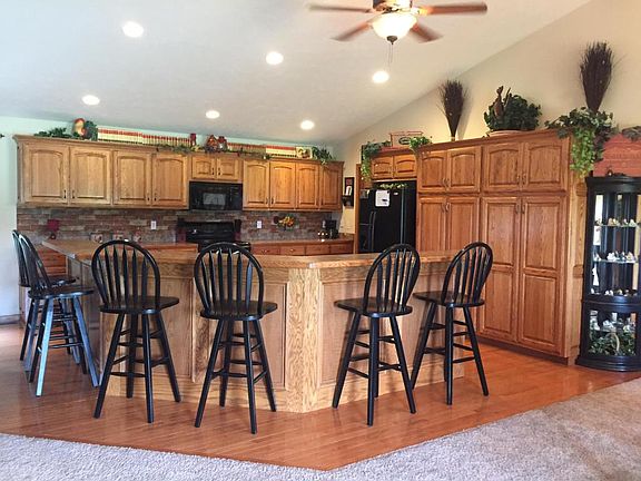Beautiful home in great location with a full finished walk-out basement on m/l 3 acres close to town and schools. Large open floor plan when you walk thru the front door, perfect for family. Dining, living area and kitchen are all open to one another with seating for 6 at the bar/island. Beautiful Oak cabinets and trim thru out the house, tons of cabinets in the kitchen for storage. Front porch is country living at it's best, Picket Fenced backyard, woods to play in, deck and patio to enjoy the beautiful scenery. Basement has 3 bedrooms and 2 baths with second living area, 4th room could be used for whatever you needed, office, playroom, sewing room. or hobby room. Also basement has 48x5 storm shelter that is the length of the front porch great for storms and storage