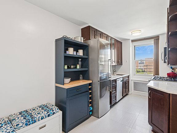The recently renovated home, well-laid out begins with its entry foyer (which can be utilized as a home office and/or designated dining area) leading to a spacious living room with oversized northern windows and glimpses of Central Park to the west. On the opposite side of the entry, the windowed eat-in kitchen offers room for a breakfast table among its generous cabinets, quartz countertops and full-size Bosch appliance package.