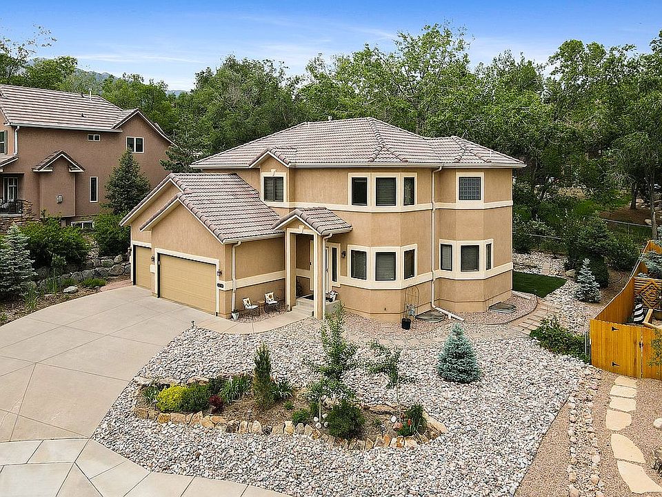 Location, location, location. . . this home has it! Secret little Capricorn Court cul de sac is quiet and close to amenities with east facing driveway for winter snow melt off. Executive custom home perfect for growing family in Skyway Park Preserve. This 4 bedroom, 4 1/2 bath, 3 level home features city lights and wild open space views in a quiet cul de sac setting. Located in the best school district in Colorado, D12. This home boasts 9 ft ceilings throughout. Gorgeous hardwood floors on entire main level. Upscale kitchen with cherry cabinets, granite slab countertops, new stainless refrigerator and dishwasher and black granite sink. Beautiful bronze fixtures throughout the home. Custom lighting, large walk in pantry and breakfast nook adjoin the kitchen which opens to family room with gas fireplace and walk out to back patio/yard. The living room and dining room make for spacious entertaining and family gatherings. The upper level has large windows for lovely views from all three large en-suite bedroom/bathrooms with spacious walk-in closets. Laundry room located on this floor is graced with granite countertop and cherry cabinets. Washer and new dryer included. Master bath has extra long and deep jetted tub and separate shower area with dual vanity sinks. All bedrooms include ceiling fans. Lower level has 4th bedroom, full bath, multipurpose room, massive storage areas and mechanical room. Home mechanics include 2 gas hot water heaters, central air and 2 gas furnaces. The exterior is low maintenance stucco with tile roof and aluminum clad wood casement windows for a lifetime of dependable performance. Completely finished, sparkling clean, 3 car garage with new epoxy floor, custom cabinets and work area are a dream come true! The outdoor living space is hardscaped with rock and stepping stones with natural moss rock flower beds. Back yard has easy to maintain premium synthetic turf, cement patio, natural rock wall with beautiful plantings of trees, shrubs and perennial flowers. All garden beds have underground irrigation on a timer. This home, near the world class Broadmoor resort, is close to shopping, restaurants, schools and Bear Creek park nature trails. You will see this home is in excellent condition and move in ready. Qualified buyers call us at 541-408-7992 to schedule your tour of this unique home! Will pay buyer’s agent commission.