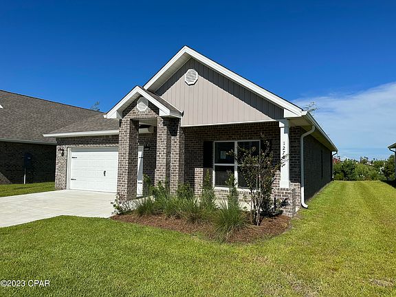 Andrews Park is centrally located off 389 in the very desirable area off Lynn Haven. Our Rhett floorplan is all brick, 4-bedroom 2-bath, it is an open concept floor plan, with a boasting 1,835 sq.ft. The Rhett floorplan has upgraded finishes throughout. You will find 9-foot ceilings with 10-foot trays and beautiful crown molding. The Rhett also has LVP flooring, granite countertops, a large kitchen island with cabinetry on both sides underneath and brushed nickel hardware. This floorplan has energy efficient windows to allow lots of beautiful natural light. The primary bathroom has a beautiful garden tub, perfect for relaxing, and a spacious walk in shower with a glass enclosure. All of these homes come with Deako lighting and Safe Haven smart home systems. Andrews Park homes feature irrigation systems with reclaimed water to help minimize your water expenses. All homes come with a landscaping and sod package as well as gutters. This particular home comes with our move in package: window blinds, Whirlpool appliances including refrigerator, washer and dryer.