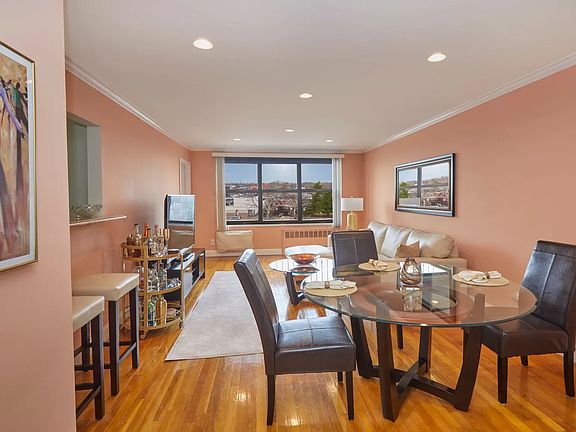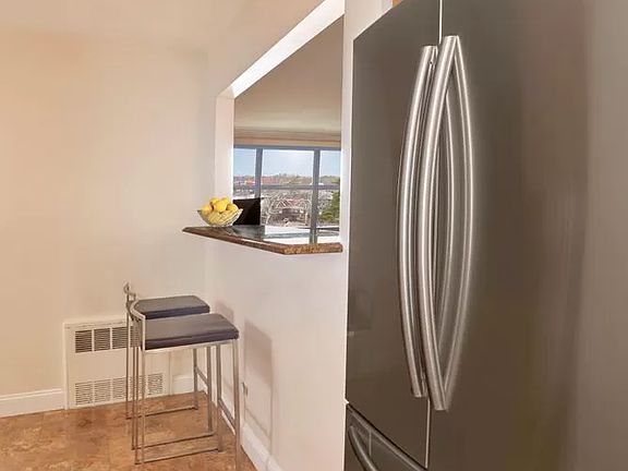Boasting spectacular skyline views and approximately 949 square feet of perfectly configured living space. Unit #6T is without question the premier residence in Kings Village. A proper foyer flows into a flexible living space, generous enough to fit a full living room setup and a dining table. The spacious kitchen has gorgeous granite countertops, stainless steel appliances (including a wine fridge) and a convenient breakfast bar that easily seats four. The king-sized primary bedroom is large enough has plenty of closet space, and the second bedroom can accommodate a queen bed. Kings Village is a well-maintained pre-war elevator building with a part-time doorman, porters, a garage (waitlist), and a laundry room. The B46 runs directly next to the building and connects at the Flatbush Brooklyn College and Newkirk Avenue stops for the 2/5 trains.
