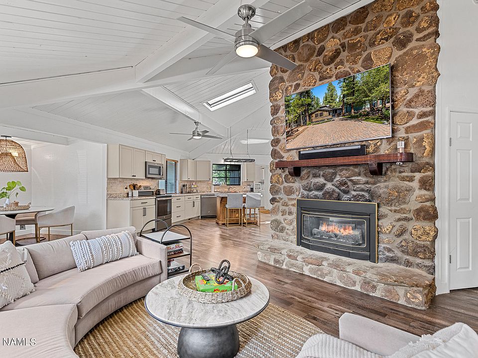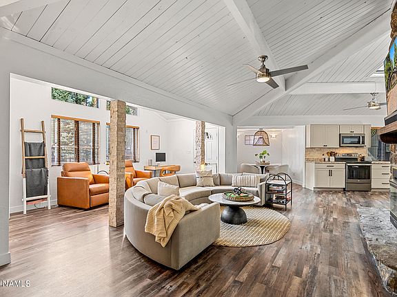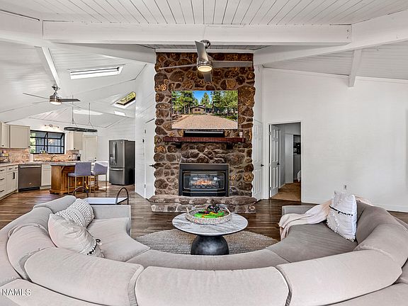 Amazing, upgraded, year-round home in the desirable Animal Hill section of Munds Park! This move-in ready, remodeled cabin shows pride of ownership and has been completely re-done. Lots of windows, great room and open kitchen with vaulted ceilings, newly painted, T&G wood ceilings, formal dining area and a huge walk-in pantry with washer/dryer, waterproof laminate flooring, newer carpet in bedrooms, newer interior and exterior paint, ceiling fans, stone/tile accent walls in the kitchen, remodeled bathrooms, granite kitchen island with new cabinets and paint, gas fireplace insert, tankless water heater, dual pane windows, workshop shed, turf landscaping, paver driveway, fruit trees, and completely fenced backyard. Very private, on a quiet street and home has a unique floor plan conducive for a large family and/or entertaining! This transformed, 1700 sq ft. home is waiting for your arrival to enjoy the cool weather. NO HOA! It is 1 mile from the Pinewood Country Club and close to the national forest, lake, hiking/ biking trails, park, restaurants, convenient store, and more! Munds Park is only 17 miles South of Flagstaff and a 2 hour drive from Phoenix. Come see your new home in our neck of the woods!
