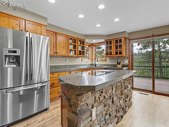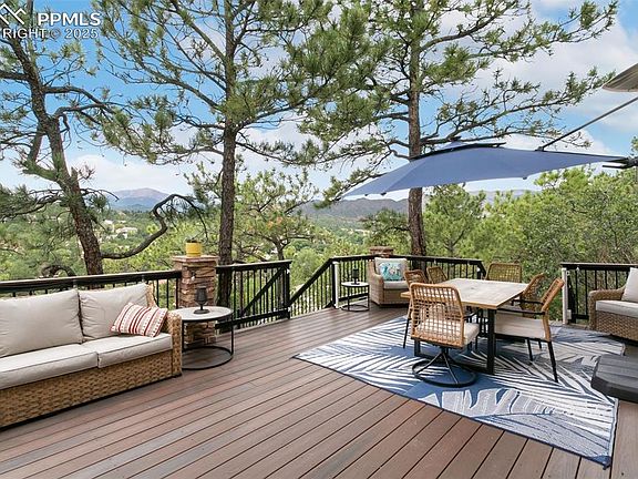 This 3 bedroom, 4 bathroom home is designed to capture Colorado living at its finest. Perched on a private flag lot with a finished 3 car garage, it offers both seclusion and convenience. Inside, soaring ceilings and walls of windows frame iconic Pikes Peak, filling the living spaces with natural light. Hardwood floors flow throughout the main level, anchored by a stone fireplace that adds warmth and charm. The thoughtful floor plan includes two suite style bedrooms: a primary retreat with breathtaking views and a secondary bedroom with its own private bath. The walkout basement has been refreshed with new paint and carpet, providing versatile space for recreation, guests, or a home office. Step outside and enjoy a true entertainer’s paradise. A composite deck extends the living area into the treetops, where an inviting lounge and dining space overlook the mountains. Just beyond, a custom lookout area with Adirondack chairs and a fire pit sets the stage for unforgettable sunsets. Beneath the deck, you’ll find a flexible space ideal for a dog run or play area. Additional highlights include a radon system for peace of mind, a heated and finished garage with a coated floor, and a location that maximizes both privacy and views. This is more than a home, it’s a front row seat to Colorado’s most stunning sunsets.