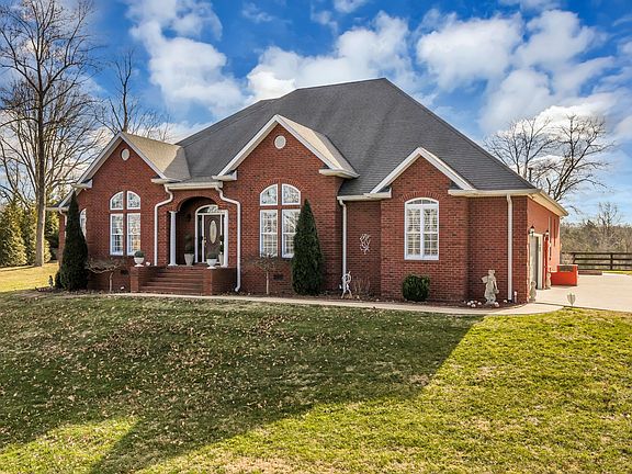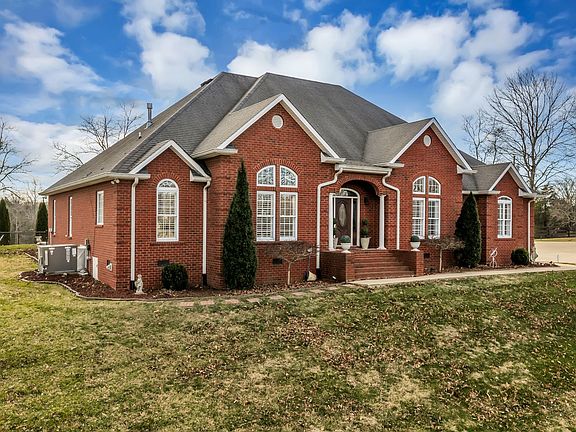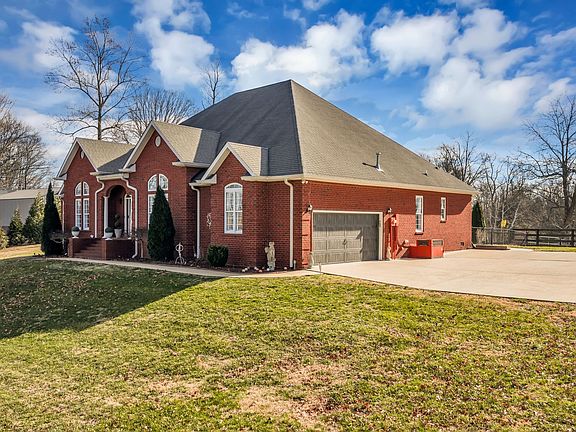 Built in 2005, this custom all-brick, single-level home rests on a beautifully landscaped 1.15-acre lot in Burns, offering exceptional privacy and timeless appeal. The chef’s kitchen features ceiling-height cherry cabinetry with lighted glass uppers, granite countertops, double ovens, a gas cooktop, and a butler’s pantry with a new wine chiller, opening effortlessly into the great room highlighted by a stacked-stone fireplace. A sunroom fills the home with natural light and looks out over the serene, level backyard, where $20K in mature landscaping surrounds a concrete firepit and expanded patio shaded by a custom pergola. Hardwood and tile flooring extend throughout the home—no carpet—while the formal dining room and flexible living room or office showcase 12-foot ceilings and custom plantation shutters. The primary suite includes a large walk-in closet with built-ins and a spa-like bath with dual vanities, a jetted tub, and an oversized linen closet. A second bedroom features its own fireplace and walk-in closet, while the third bedroom provides access to unfinished attic space already plumbed and wired for a future bonus room. The shared bath is equipped with a steam shower and seating. Recent updates include two new water heaters and HVAC systems installed just two years ago. Additional highlights include a spacious laundry room with sink, cabinetry, and countertops conveniently located off the kitchen and garage. Located just minutes from Fairview, Dickson, and I-40, this elegant one-level home blends modern updates, classic design, and ideal spaces for entertaining.